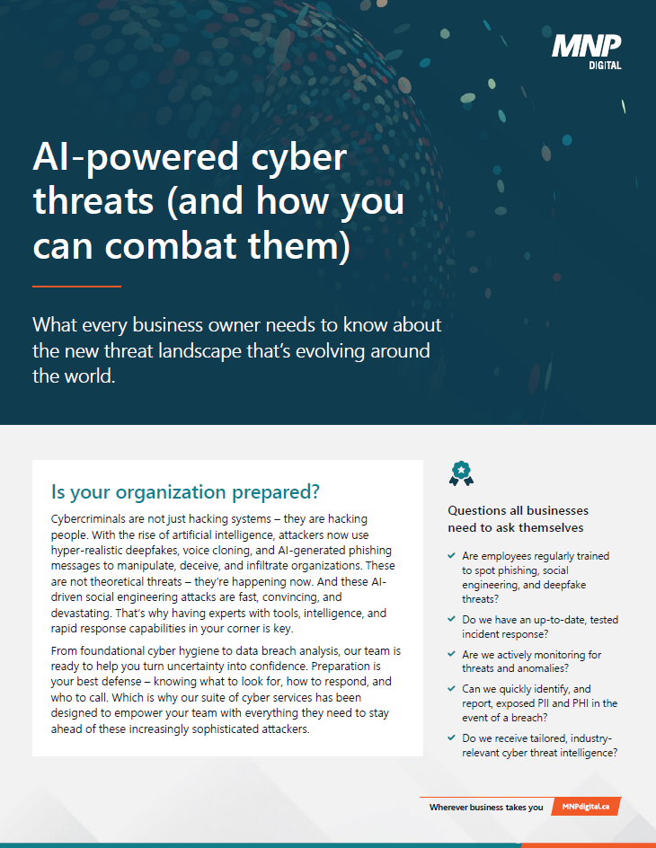 AI-powered cyber threats are ramping up at an alarming pace – and businesses of all sizes across Canada are the target. Don’t wait until an attack. Partner with a team that understands the cyber landscape and can help you turn uncertainty into confidence.